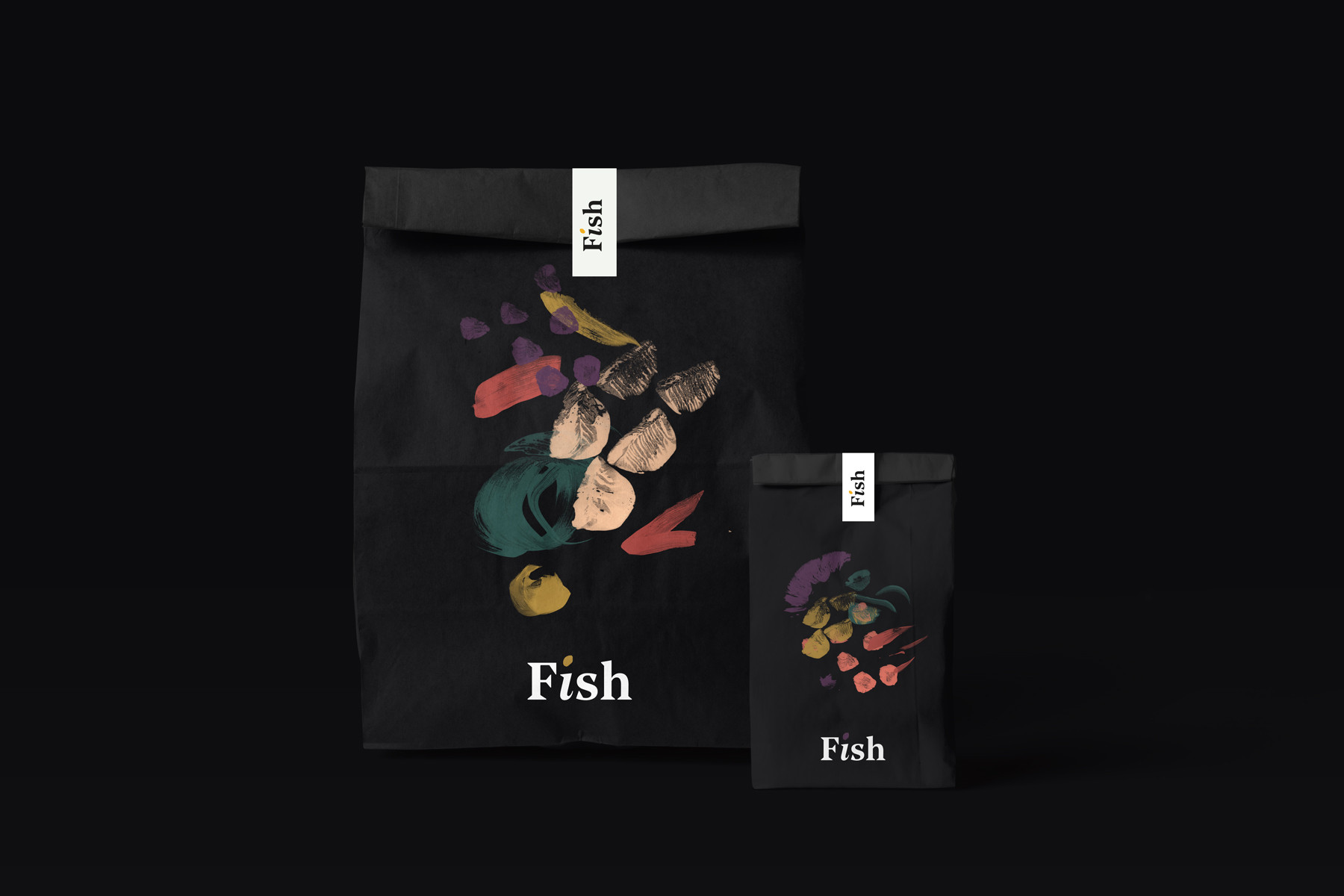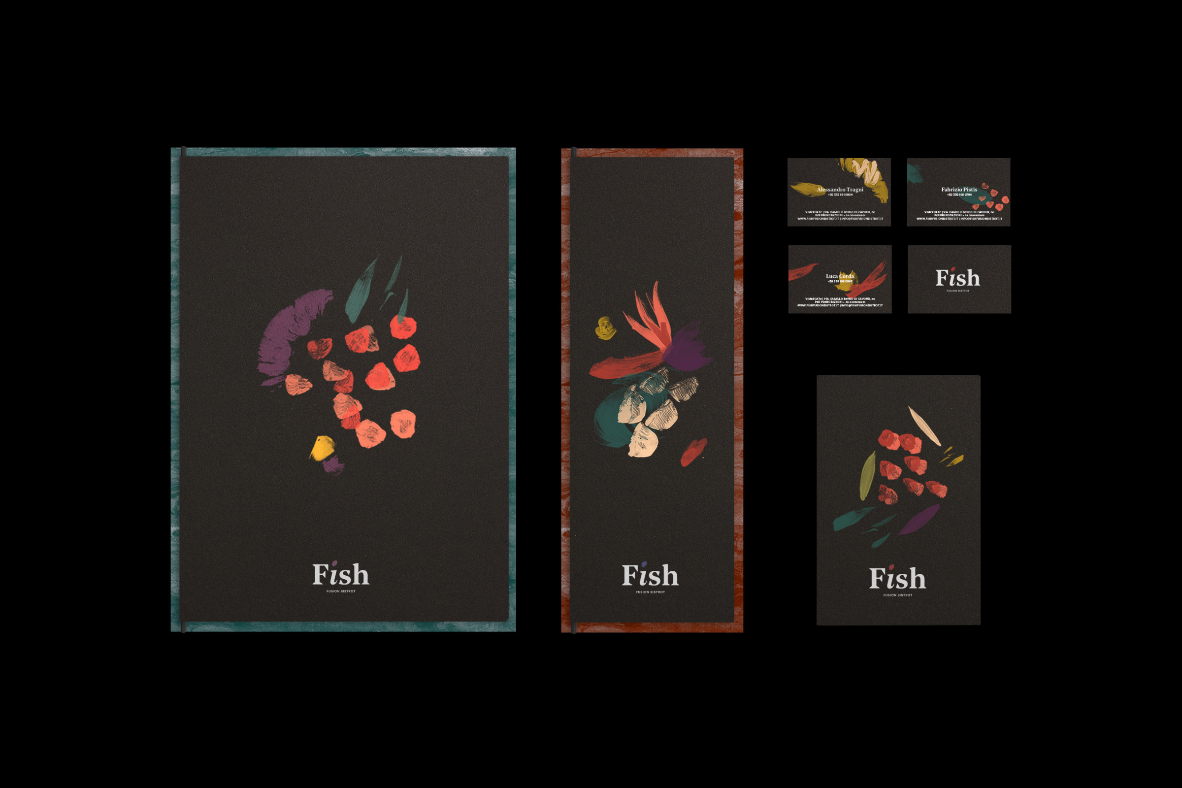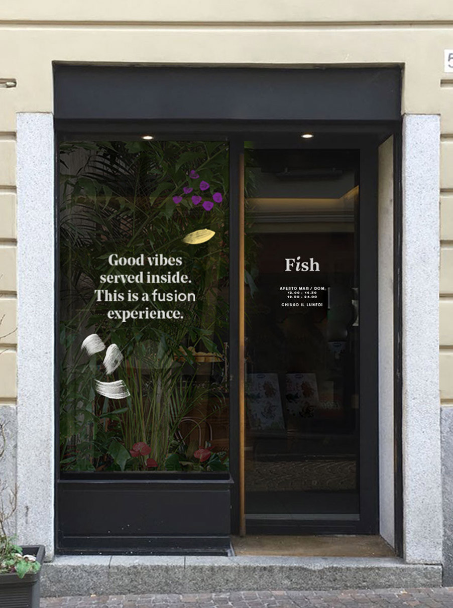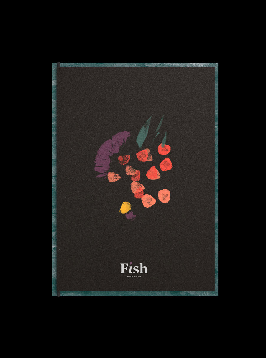 Partire da ingredienti semplici per creare piatti sublimi. Questa è l’alchimia preziosa della cucina fusion, un mix di tradizioni, qualità e creatività. Il piatto diventa la tela dove lo chef comunica attraverso colori, forme e consistenze. L'identità visiva di Fish attraverso illustrazioni e pennellate astratte rappresa la vivace tavolozza degli ingredienti.