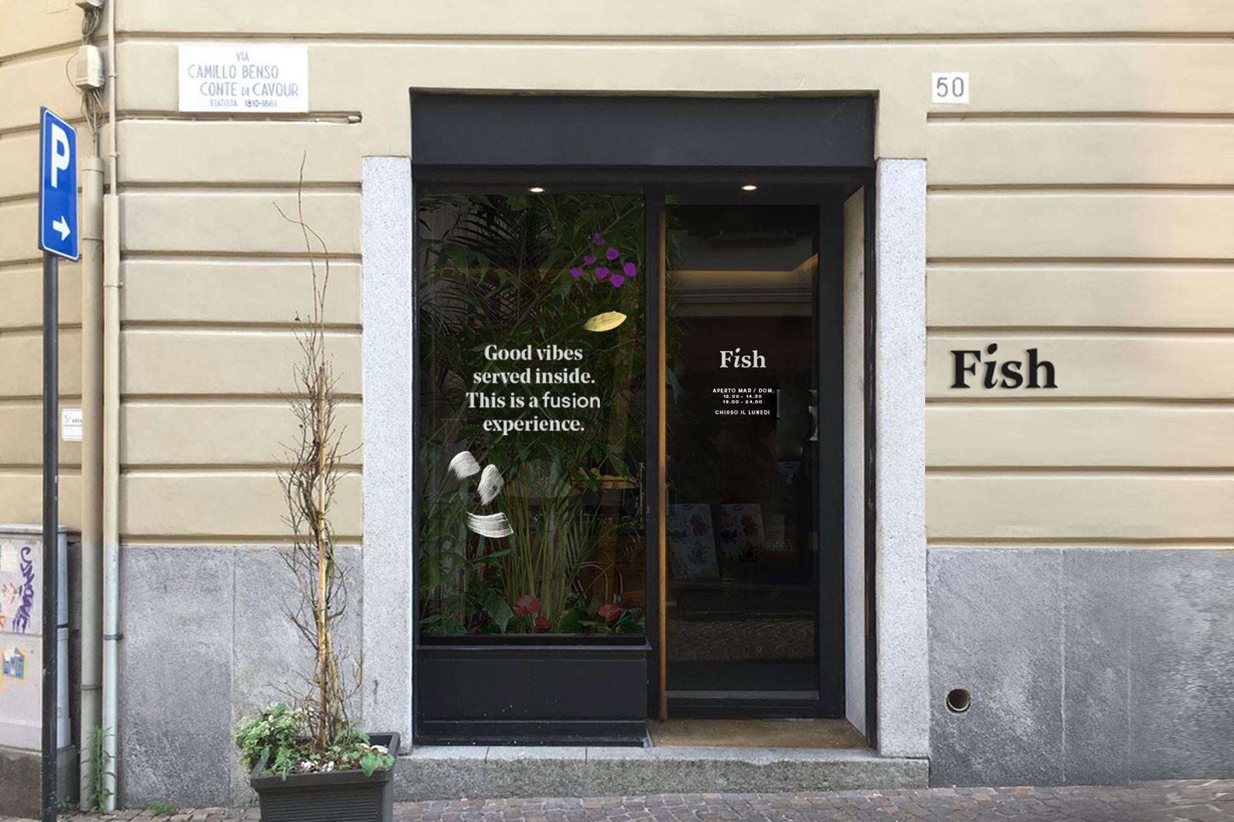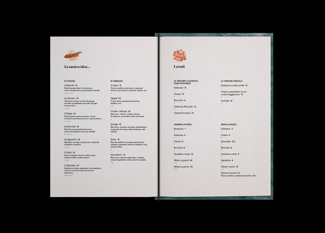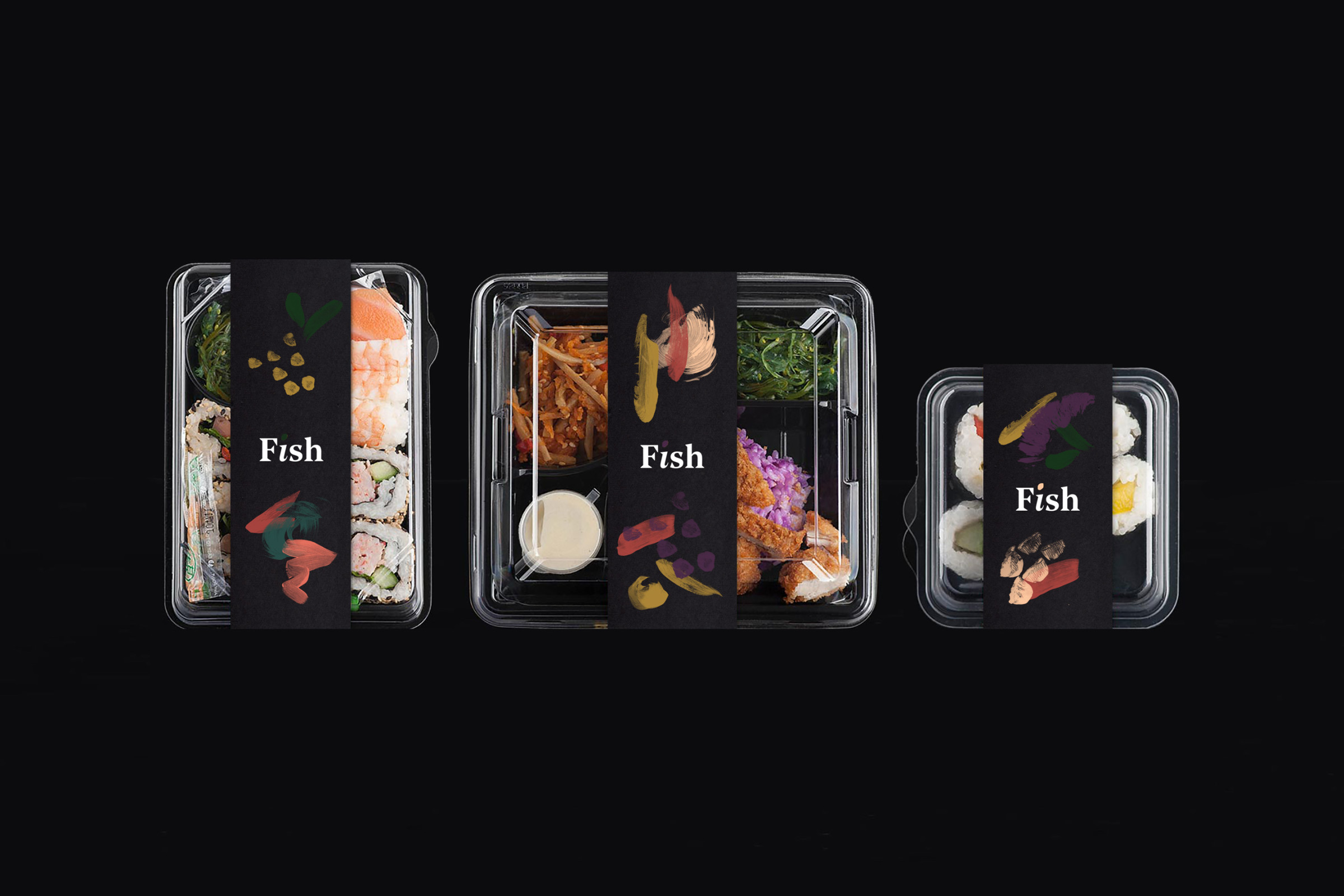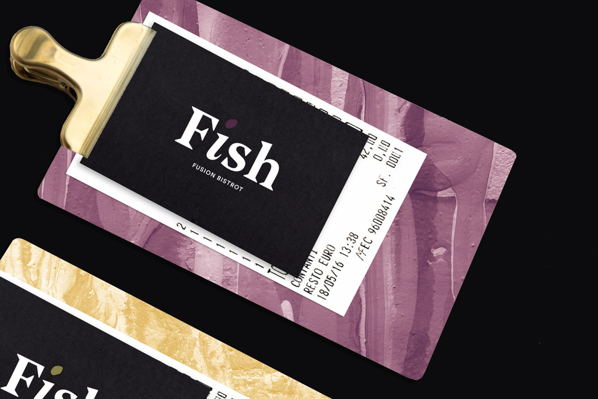 Partire da ingredienti semplici per creare piatti sublimi. Questa è l’alchimia preziosa della cucina fusion, un mix di tradizioni, qualità e creatività. Il piatto diventa la tela dove lo chef comunica attraverso colori, forme e consistenze. L'identità visiva di Fish attraverso illustrazioni e pennellate astratte rappresa la vivace tavolozza degli ingredienti.