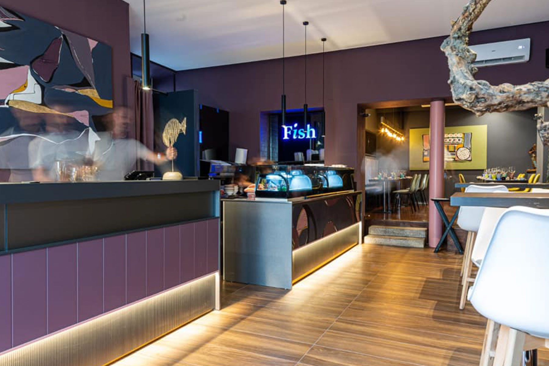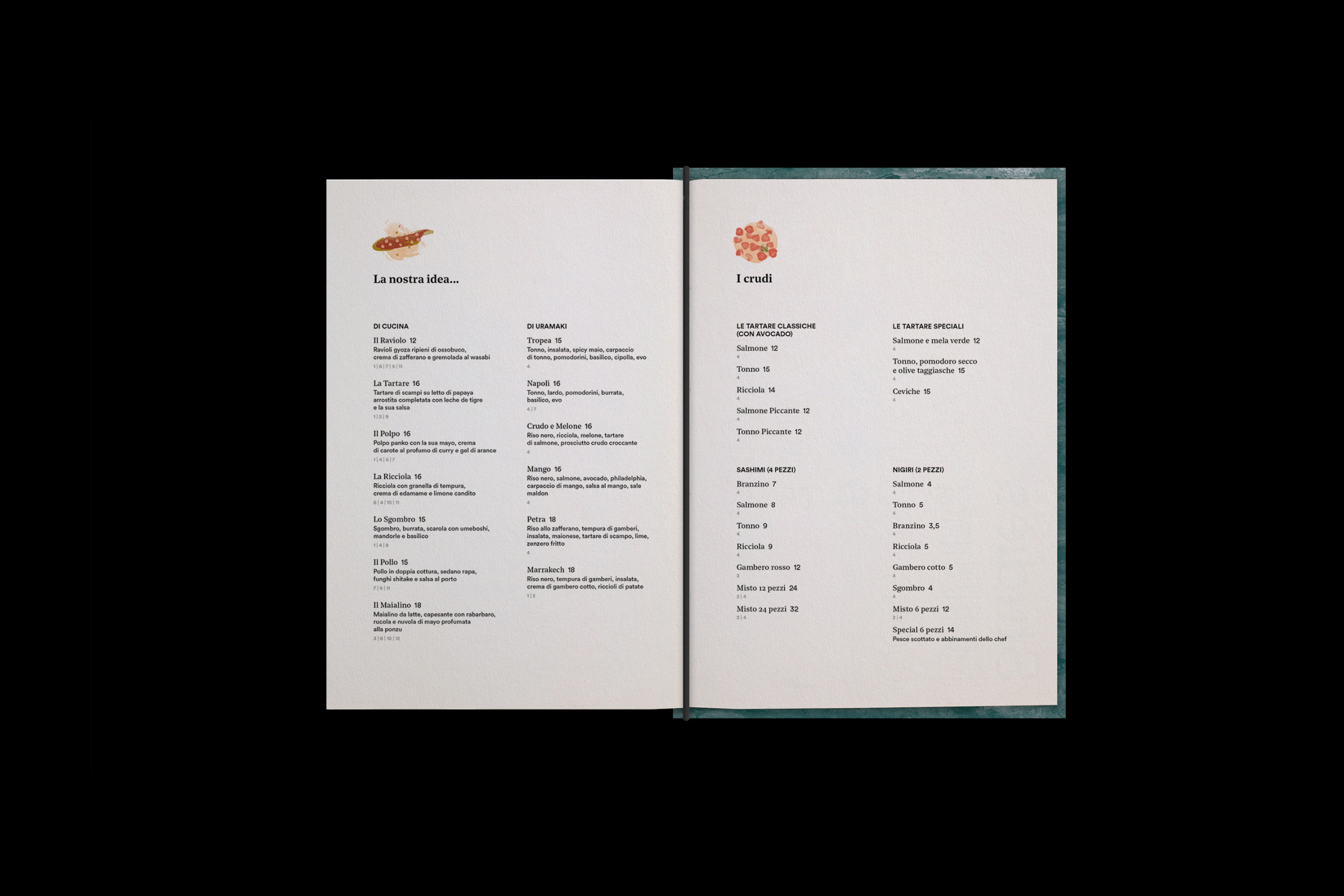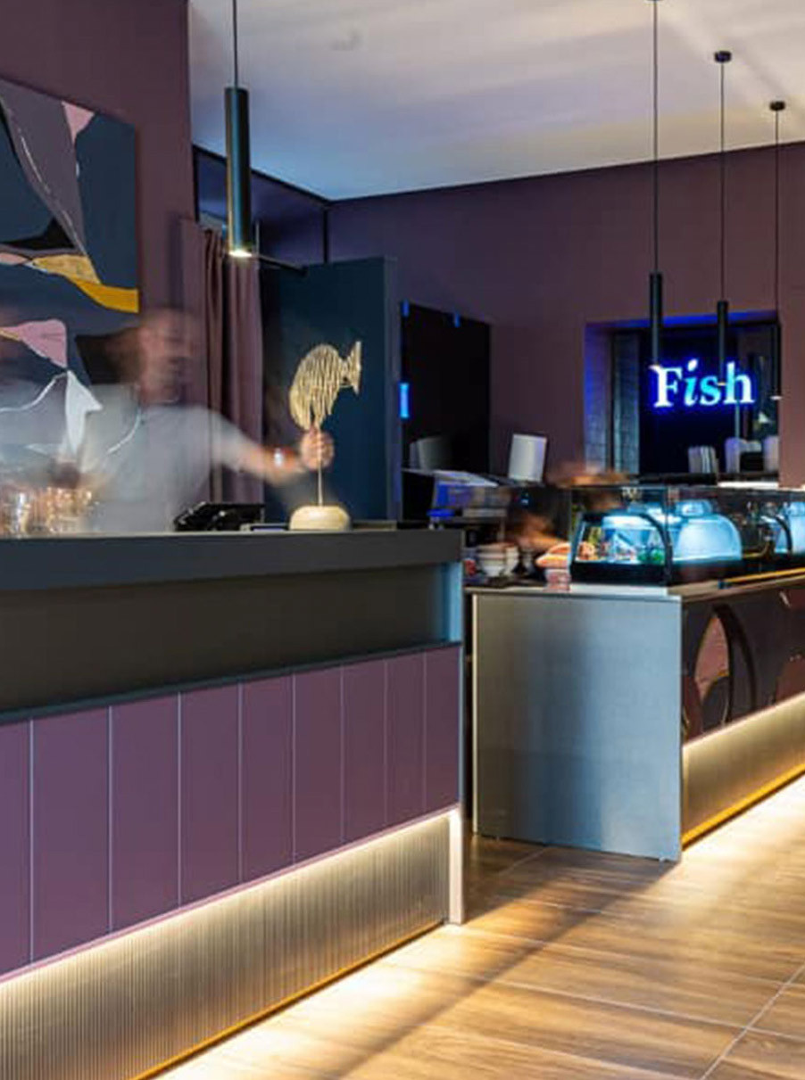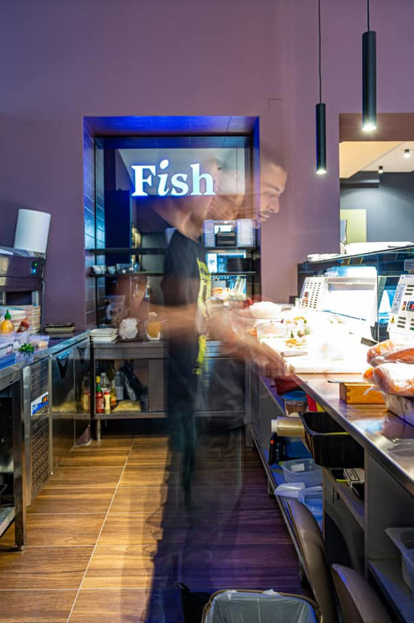 Partire da ingredienti semplici per creare piatti sublimi. Questa è l’alchimia preziosa della cucina fusion, un mix di tradizioni, qualità e creatività. Il piatto diventa la tela dove lo chef comunica attraverso colori, forme e consistenze. L'identità visiva di Fish attraverso illustrazioni e pennellate astratte rappresa la vivace tavolozza degli ingredienti.