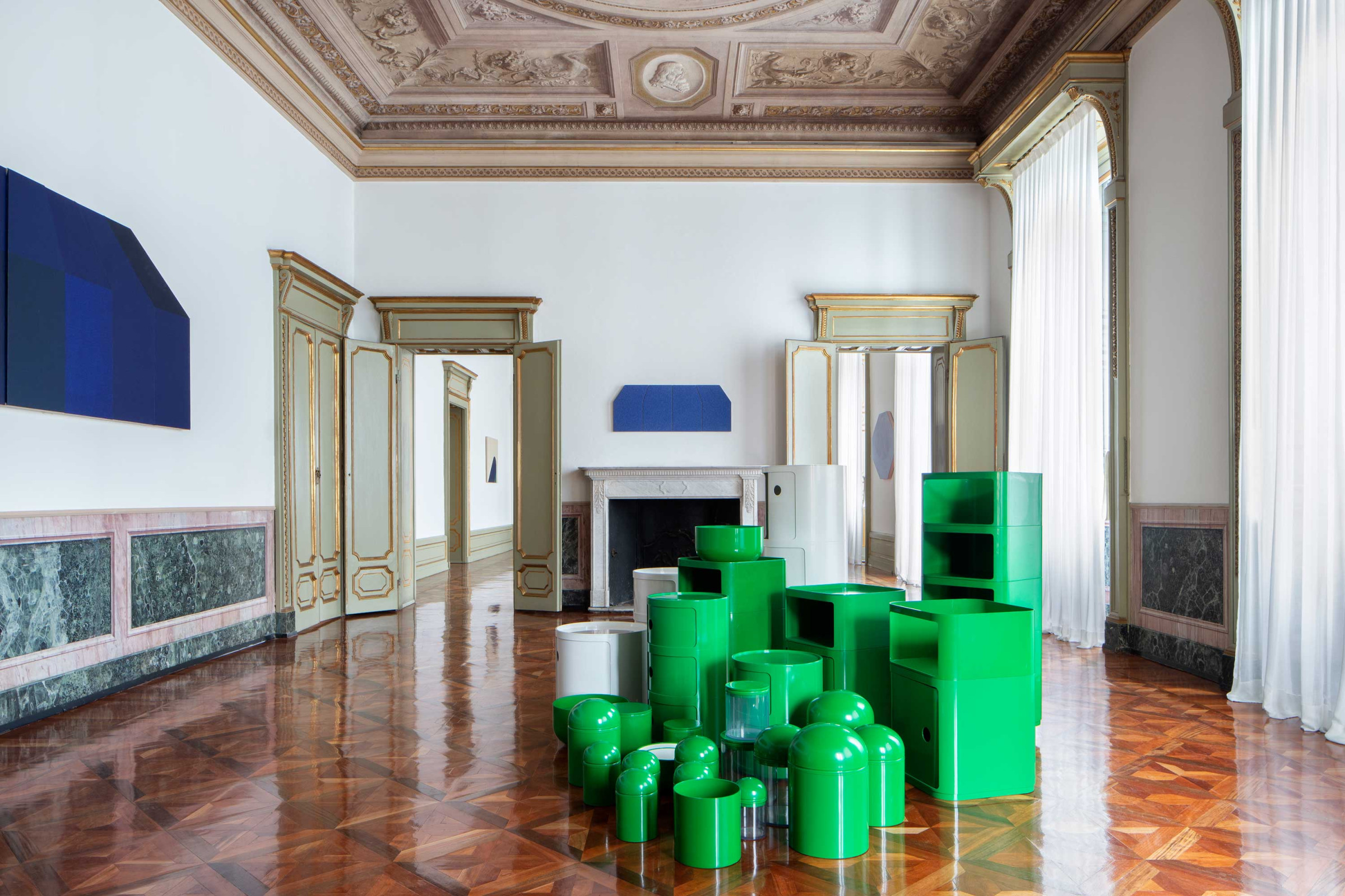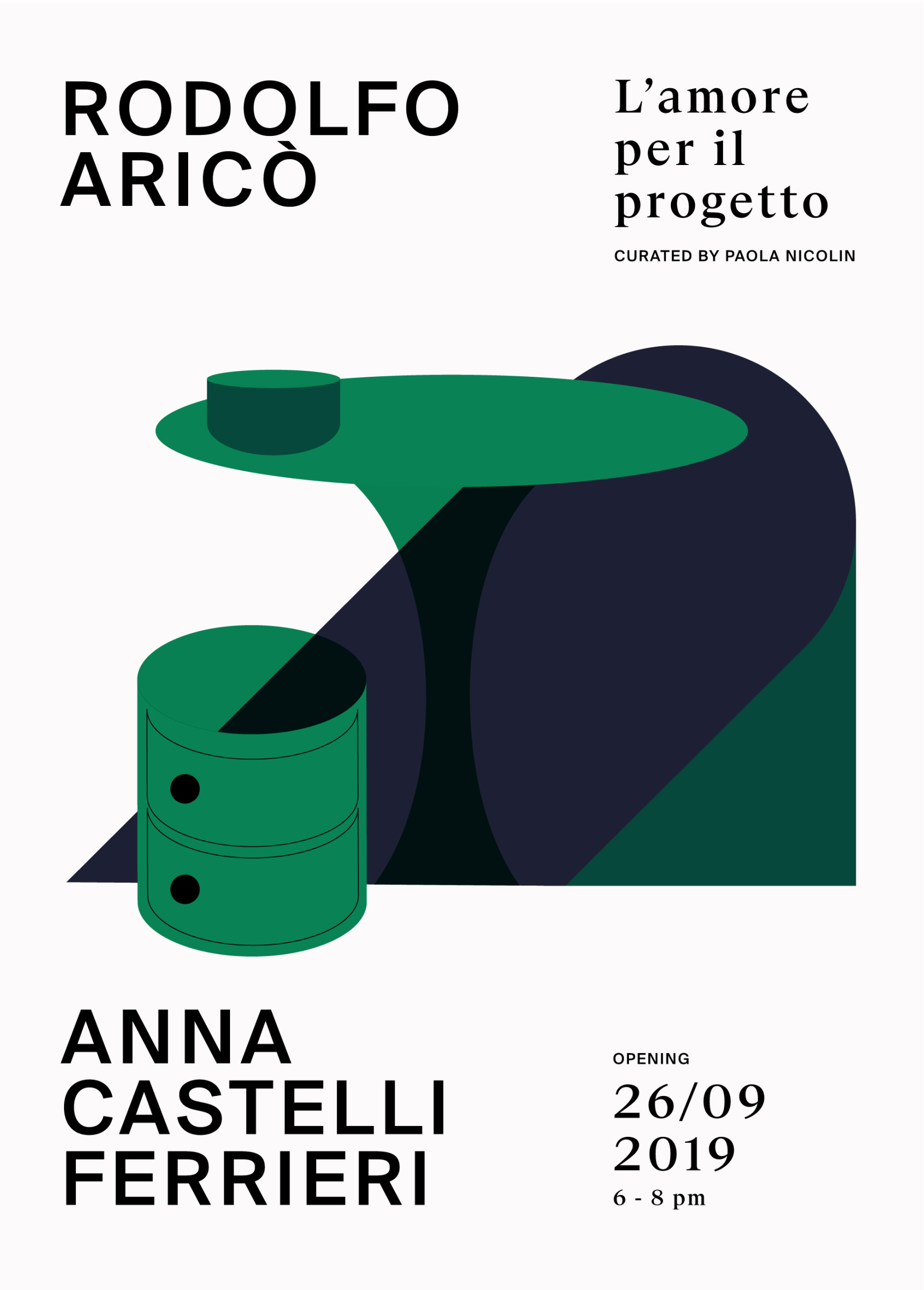 La mostra Rodolfo Aricò / Anna Castelli Ferrieri. L'Amore per il progetto, allestita nella galleria d'arte Tommaso Calabro presenta due protagonisti del secondo Novecento italiano, accomunati da un’attenzione puntuale alla fase di progettazione delle proprie opere. Per comunicare la mostra abbiamo progettato due inviti le cui illustrazioni intrecciano le opere iconiche dei due progettisti. Il catalogo di accompagnamento invece è caratterizzato da una copertina il cui scopo è quello di ricordare attraverso il tatto la texture delle tele di Aricò in contrapposizione all’effetto liscio e lucido degli oggetti di plastica della Castelli.