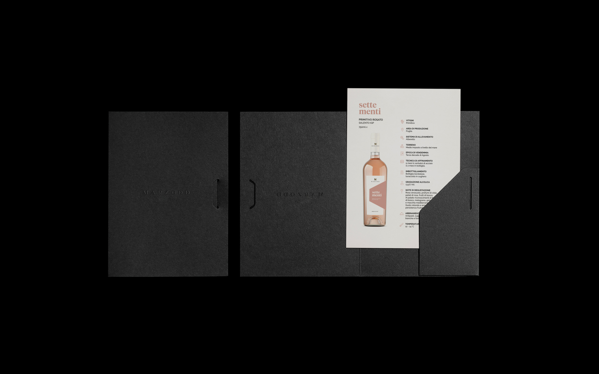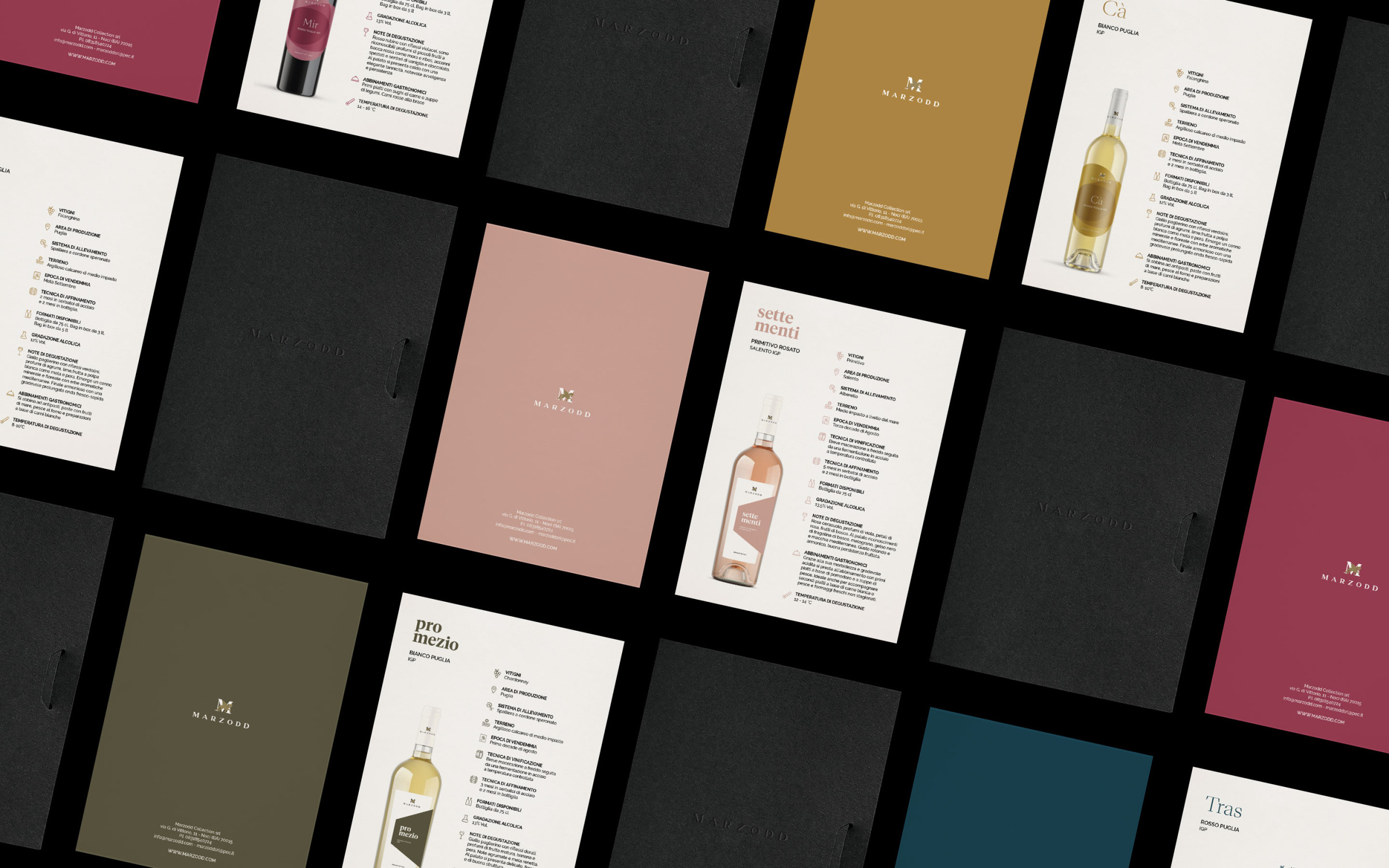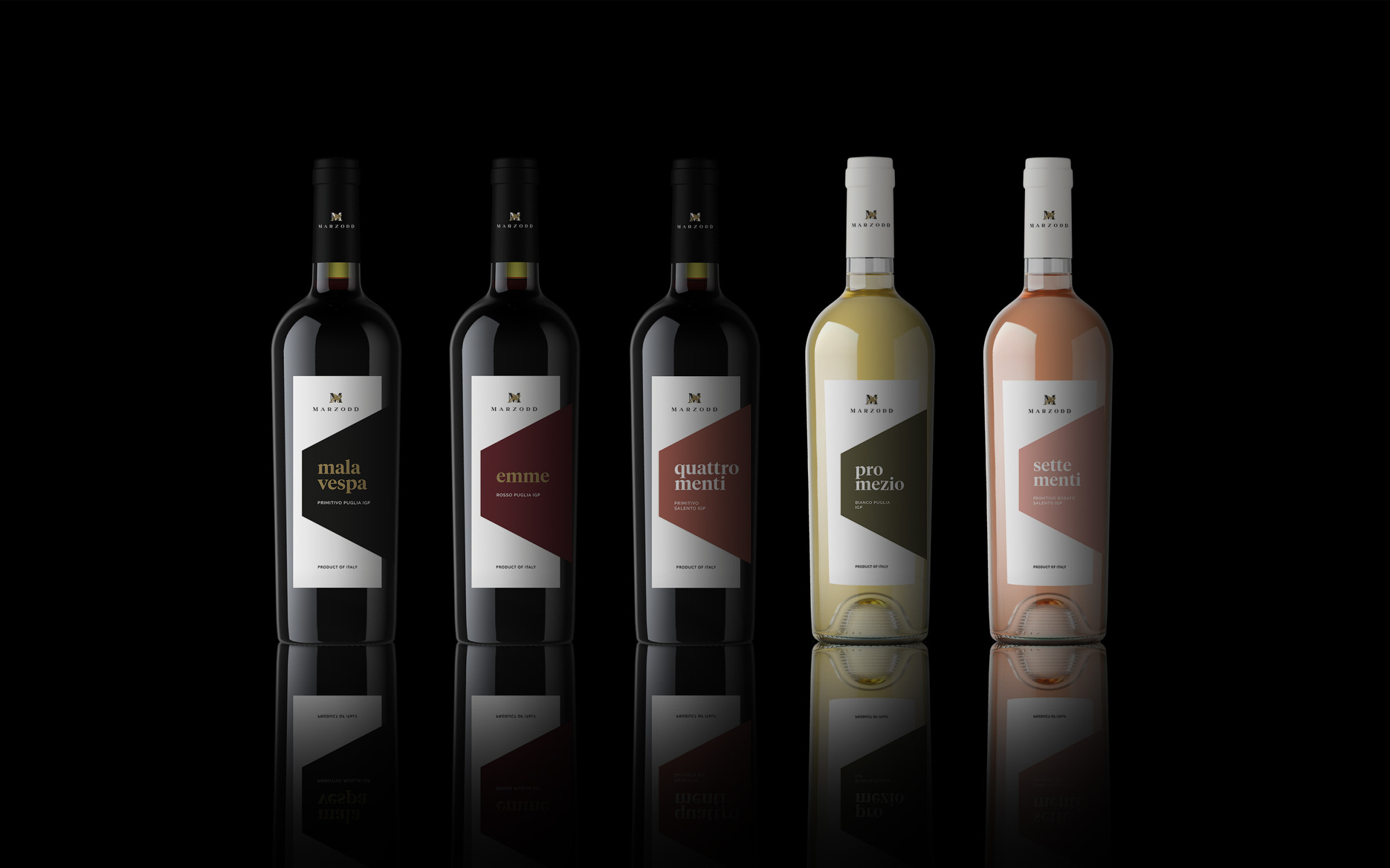 La linea di vini di fascia alta è caratterizzata da una etichetta romboidale che sormonta una classica etichetta rettangolare. Il design è elegante, sofisticato e minimale. La linea di fascia bassa che si rivolge a un target più giovane, gioca con un etichetta fuori dagli schemi classici colorata, fresca e pop.