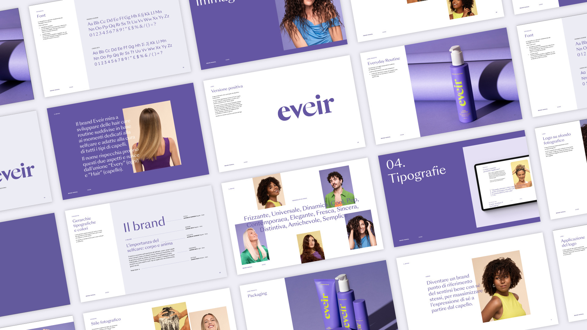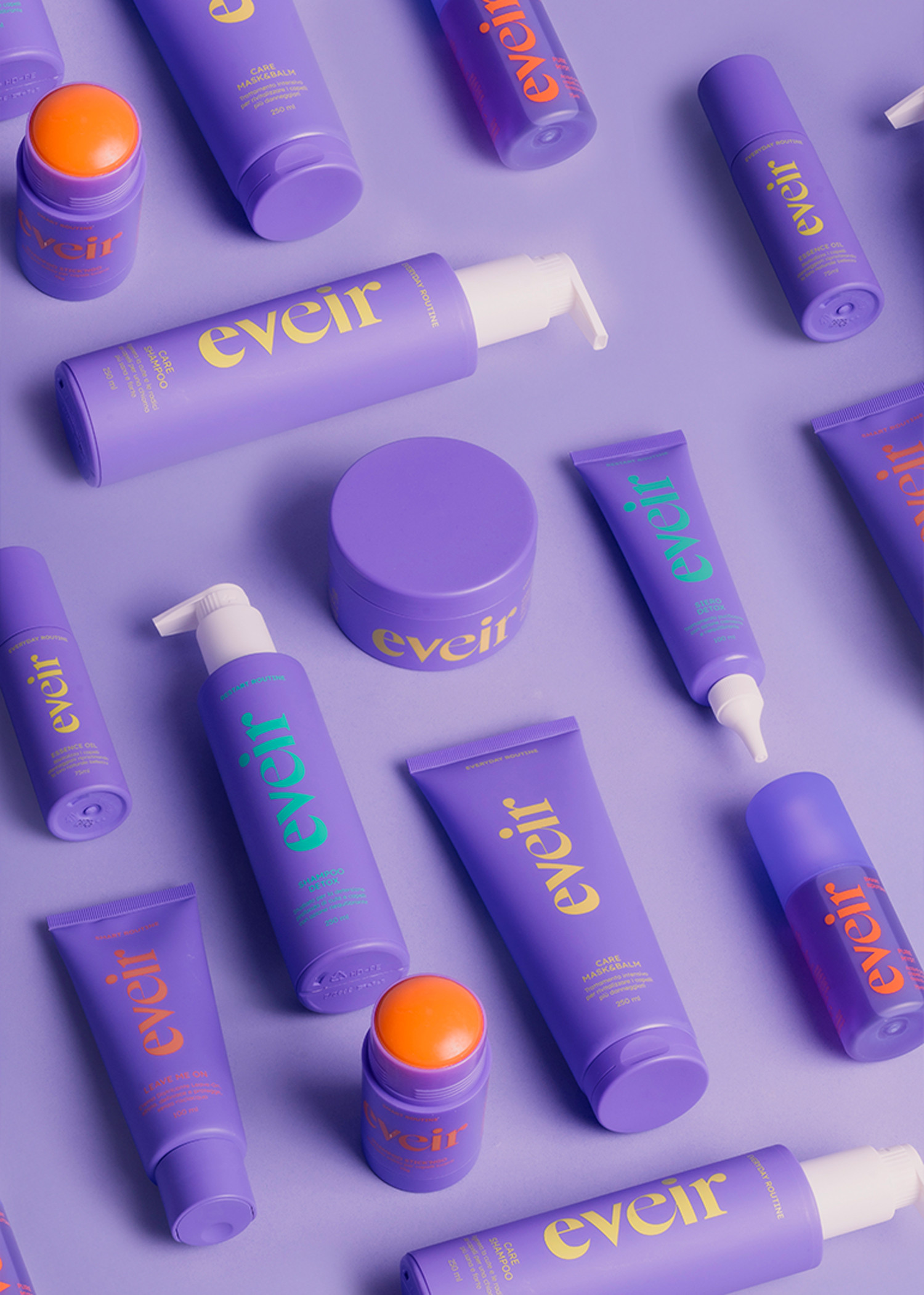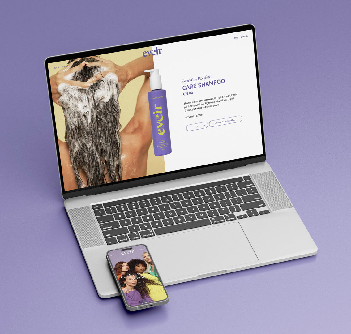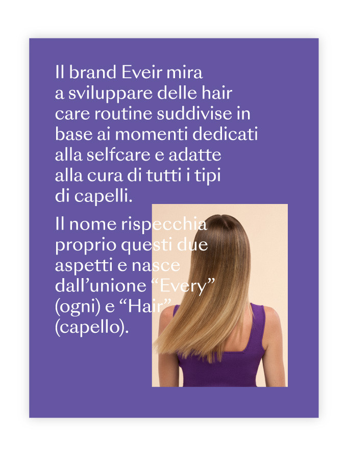 Eveir nasce dalla visione di Paola Turani, modella e influencer italiana, che ha voluto creare un brand di haircare capace di rispondere alle esigenze di ogni tipo di capello. Fond ha collaborato strettamente con Paola e il suo team, curando ogni fase del processo creativo: dalla brand strategy fino al lancio del prodotto. Il risultato? Un marchio inclusivo, frizzante e autentico che celebra la bellezza dei capelli in tutte le loro forme.