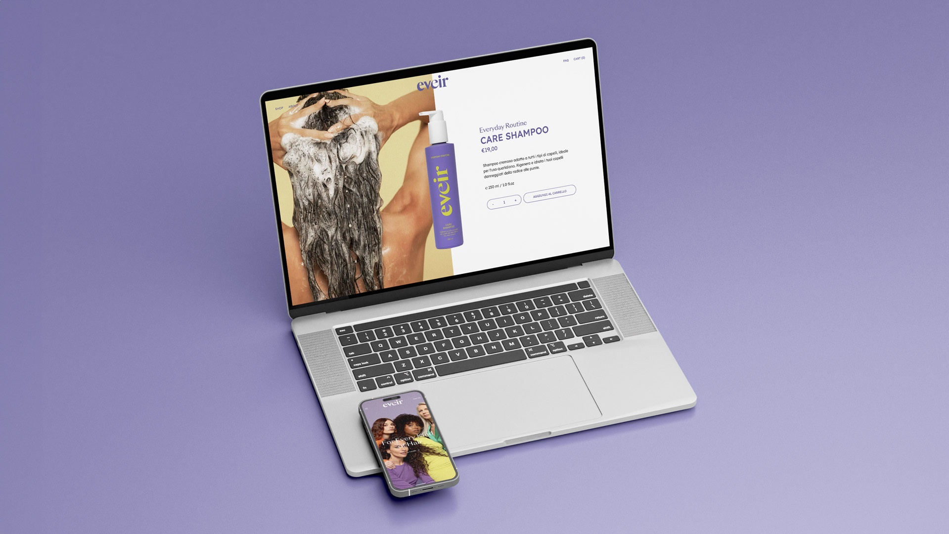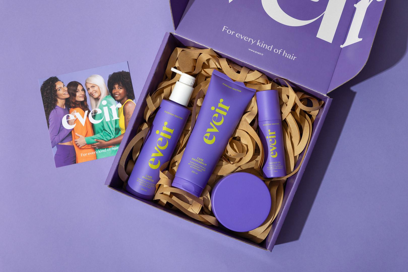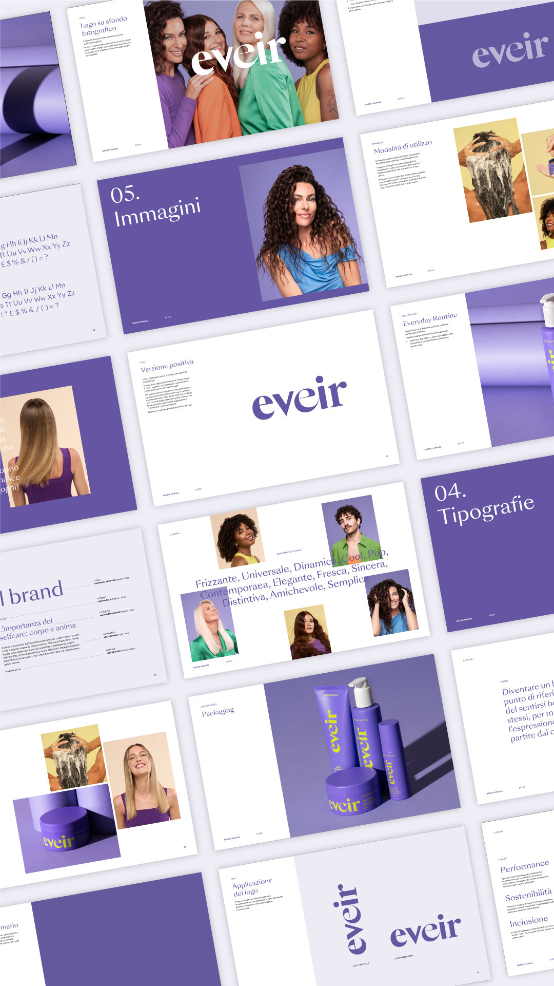Eveir nasce dalla visione di Paola Turani, modella e influencer italiana, che ha voluto creare un brand di haircare capace di rispondere alle esigenze di ogni tipo di capello. Fond ha collaborato strettamente con Paola e il suo team, curando ogni fase del processo creativo: dalla brand strategy fino al lancio del prodotto. Il risultato? Un marchio inclusivo, frizzante e autentico che celebra la bellezza dei capelli in tutte le loro forme.