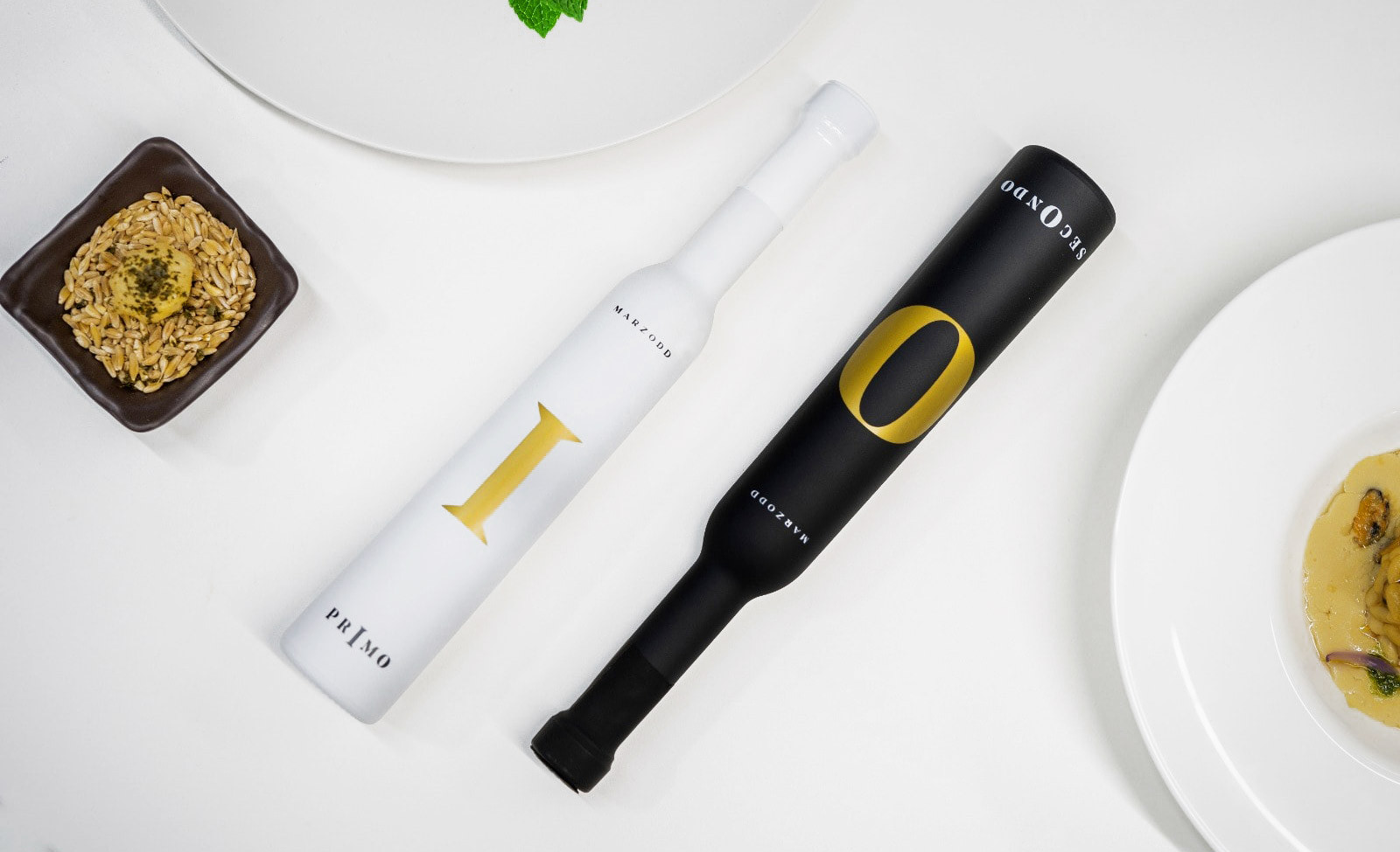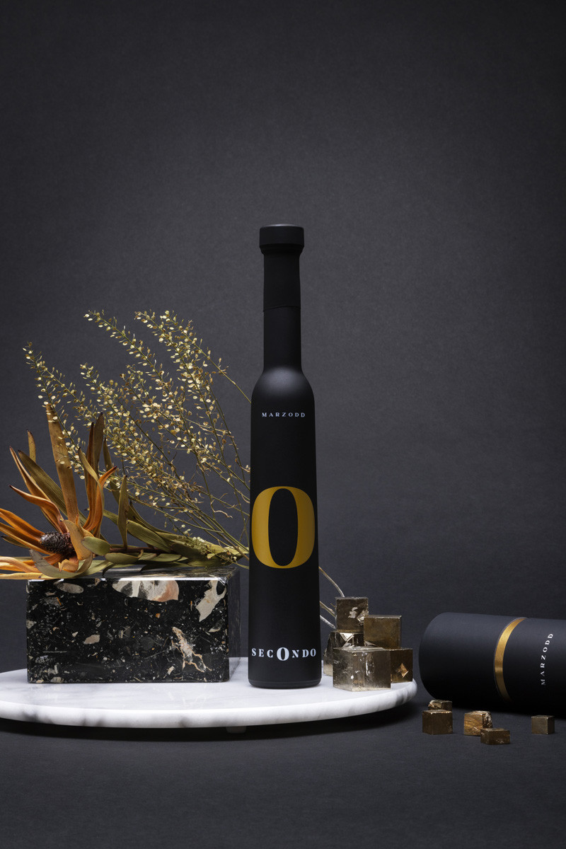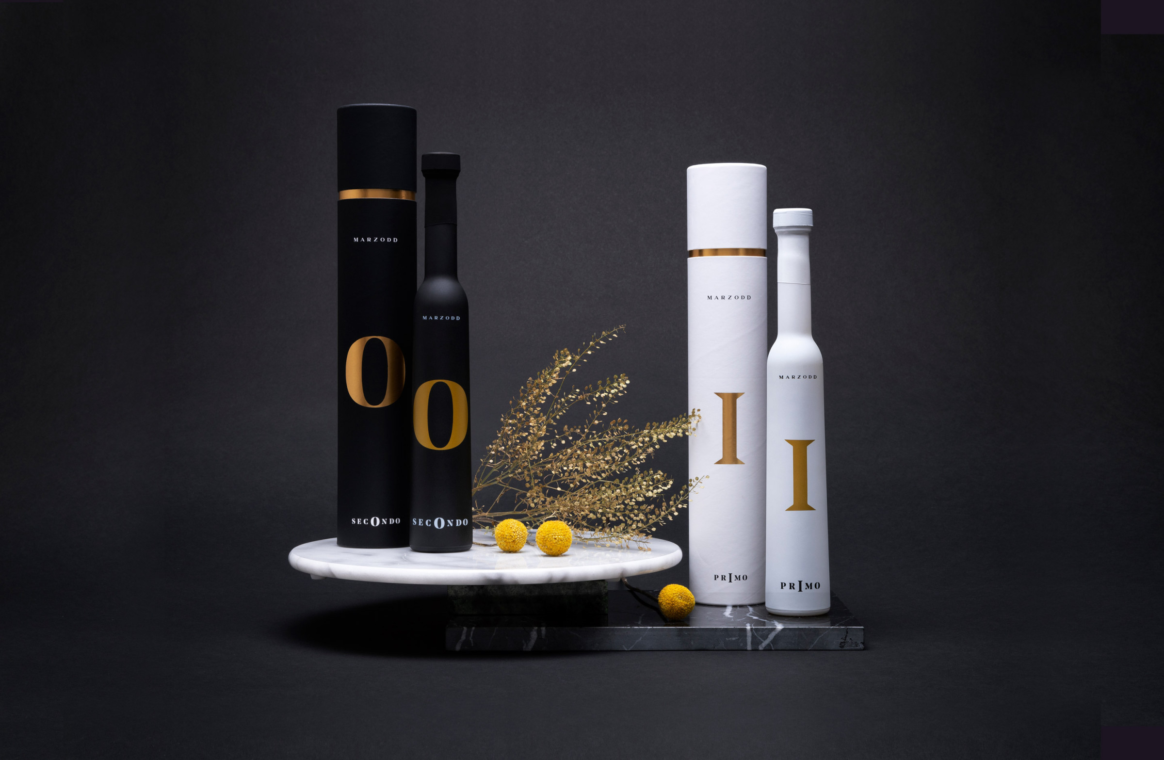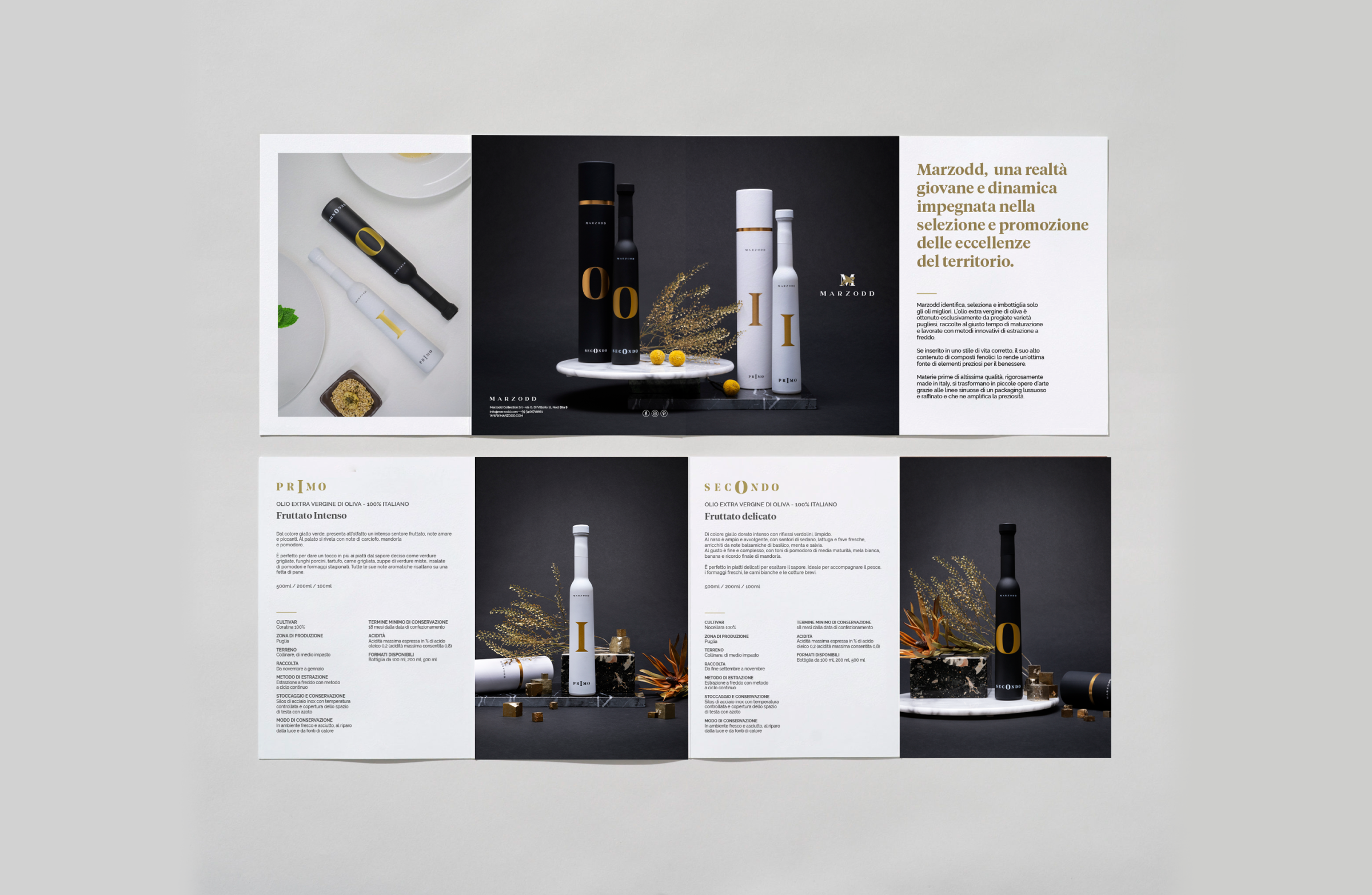 Un design pulito ed essenziale dove il bianco e nero viene impreziosito dalla lamina oro. La grafica è minimale ma nella sua semplicità nasconde un significato: estraendo la lettera centrale di Primo e Secondo dove la I di primo simboleggia il tronco dell’ulivo e la O di Secondo simboleggia l’oliva.