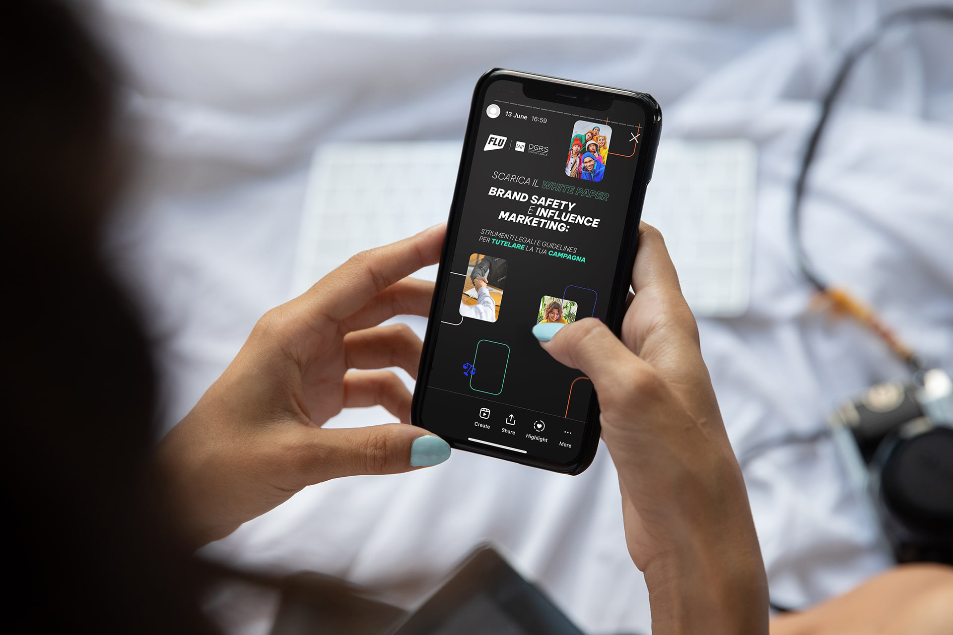 inequivocabilmente allo schermo di uno smartphone. Questo segno grafico diventa il key visual dell'identità visiva, presentato con giochi di sovrapposizioni a più layers per trasferire l’idea di diffusione, condivisione e popolarità, concetti chiave dell'influenzar marketing.