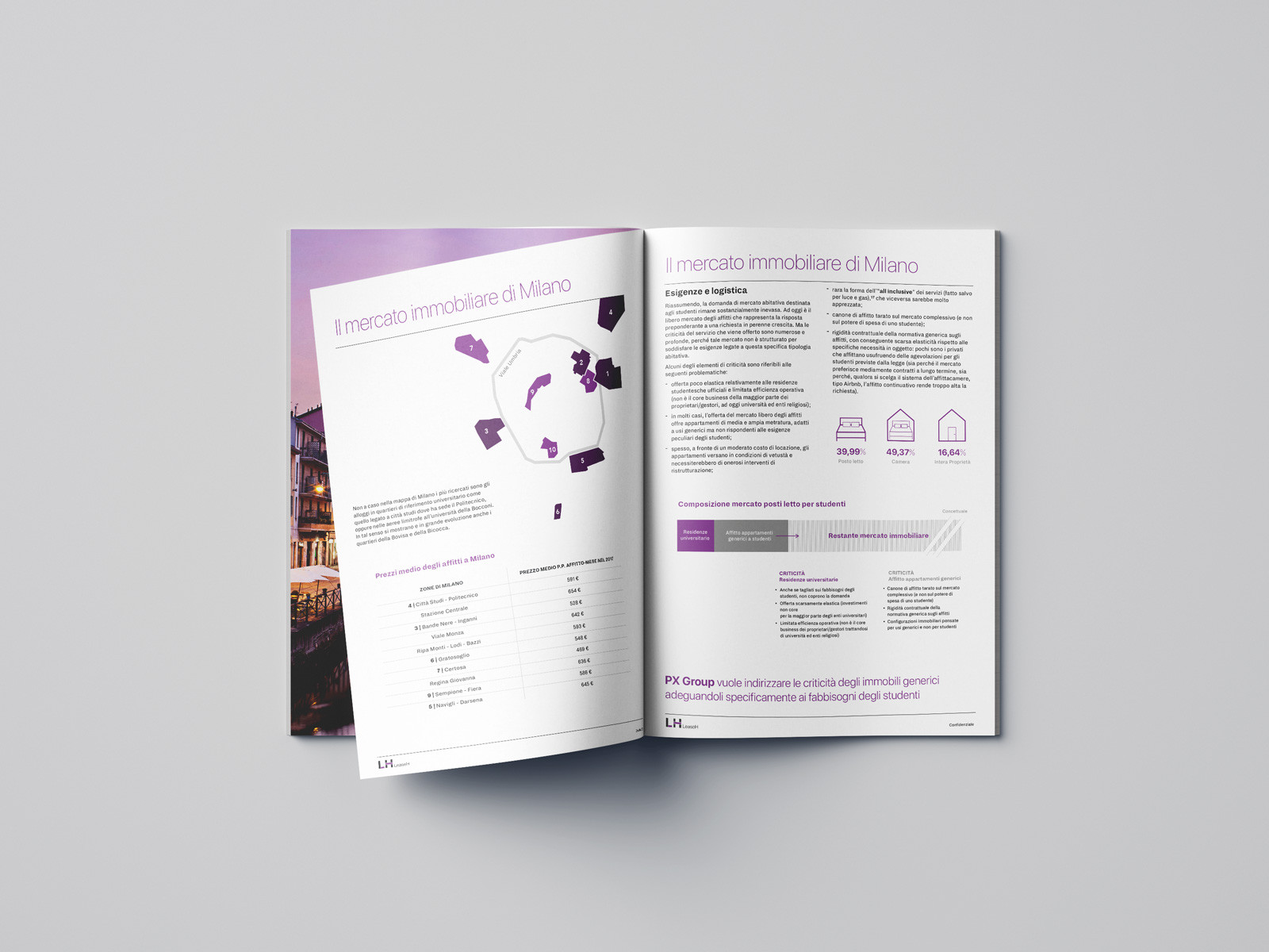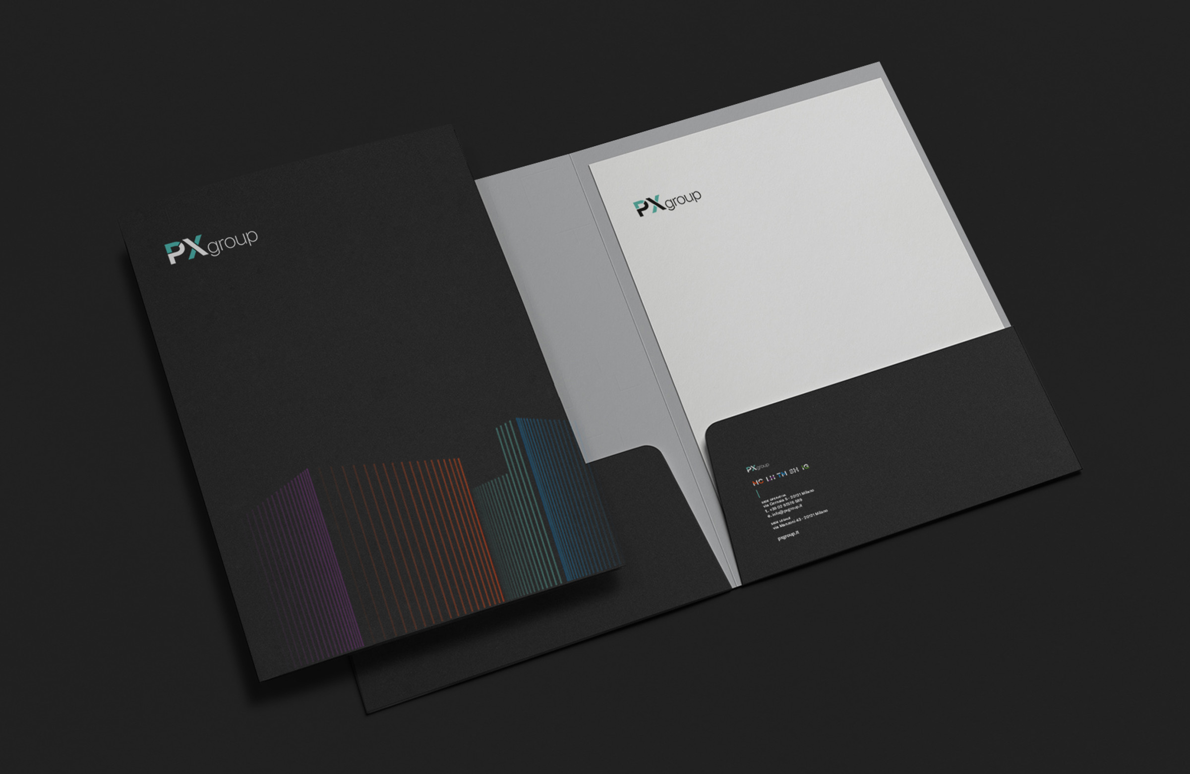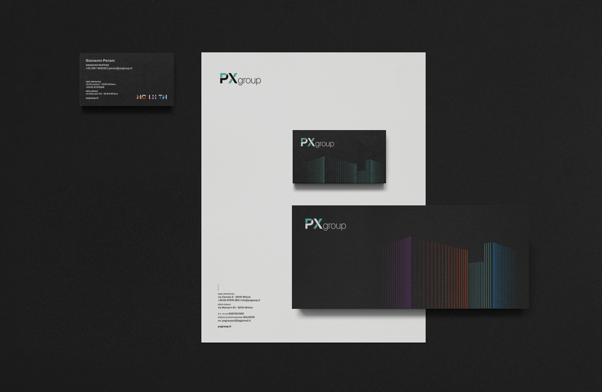 Il logo sottolinea la doppia anima di PX Group. Le lettere dei loghi delle società sono composte da due parti, la parte grigia che rappresenta l’animo più tecnico, pratico, organizzato e la parte colorata che rappresenta l’animo più innovativo, creativo e visionario. L’identità è arricchita dall’uso di elementi grafici che rappresentano in maniera evocativa e allo stesso tempo tecnica degli immobili per creare un rimando visivo e concreto al core business di PX Group.